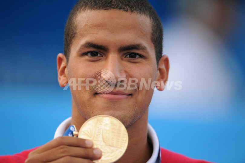 2位には14分41秒38でライアン・コクラン(%%Ryan Cochrane%%、カナダ)、3位には14分46秒84で孫楊(%%Sun Yang%%、中国)が入った。写真は、優勝を果たし、表彰台でポーズをとるウサマ・メルーリ。(2009年8月2日撮影)(c)AFP/MARTIN BUREAU