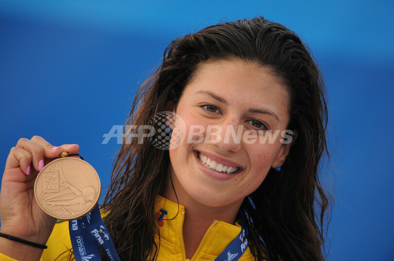 2位には4分32秒12でクリスティ・コベントリー(%%Kirsty Coventry%%、ジンバブエ)、3位には4分32秒29でステファニー・ライス(%%Stephanie Rice%%、オーストラリア)が入った。写真は表彰台でポーズをとる3位のステファニー・ライス。(2009年8月2日撮影)(c)AFP/MARTIN BUREAU