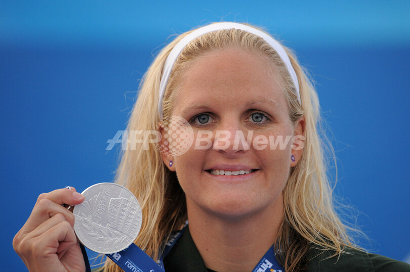 2位には4分32秒12でクリスティ・コベントリー(%%Kirsty Coventry%%、ジンバブエ)、3位には4分32秒29でステファニー・ライス(%%Stephanie Rice%%、オーストラリア)が入った。写真は表彰台でポーズをとる2位のクリスティ・コベントリー。(2009年8月2日撮影)(c)AFP/MARTIN BUREAU
