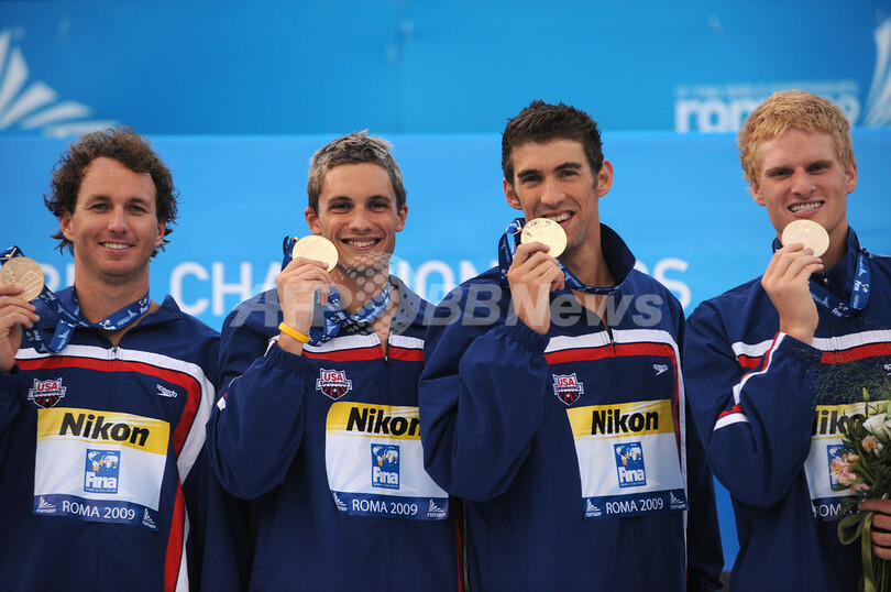 【8月3日 AFP】第13回世界水泳選手権(13th World Swimming Championships)競泳男子4x100メートルメドレーリレー決勝。米国が3分27秒28の世界新記録で優勝し、マイケル・フェルプス(Michael Phelps)は今大会5個目の金メダルを獲得した。