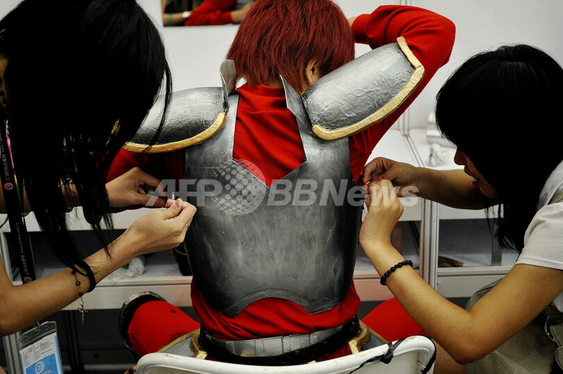 日本発の「コスプレ」は、今や中国でも大人気。ファンタジーを求める若者たちが、お気に入りのビデオゲームやアニメキャラクターの扮装(ふんそう)で舞台で仮想現実の世界を展開する。「ChinaJoy」主催者によると、今回の来場者は2万人を超えた。