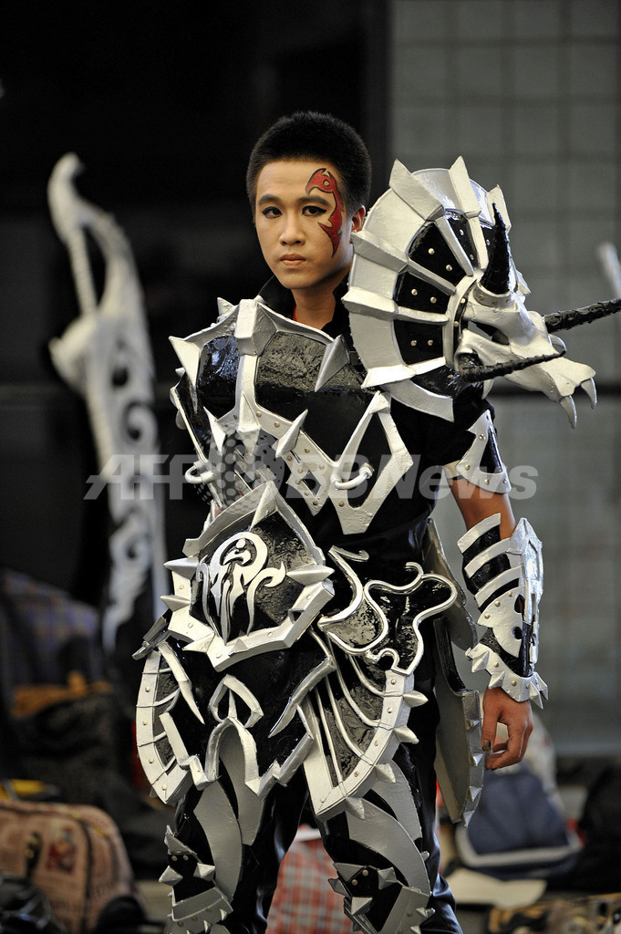 日本発の「コスプレ」は、今や中国でも大人気。ファンタジーを求める若者たちが、お気に入りのビデオゲームやアニメキャラクターの扮装(ふんそう)で舞台で仮想現実の世界を展開する。「ChinaJoy」主催者によると、今回の来場者は2万人を超えた。