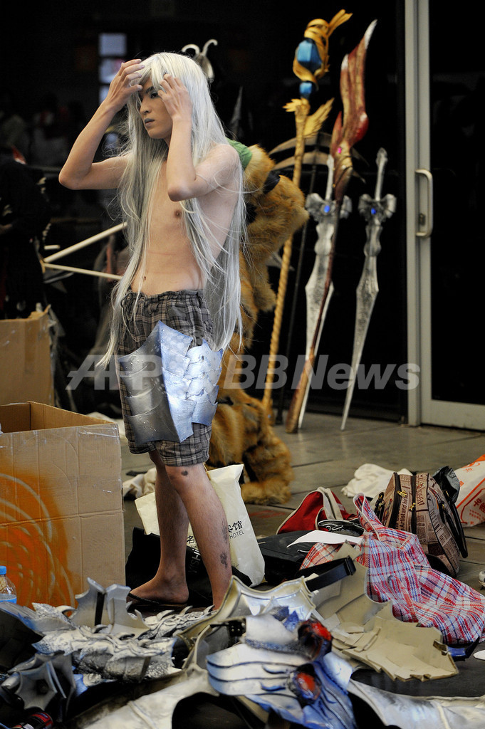 日本発の「コスプレ」は、今や中国でも大人気。ファンタジーを求める若者たちが、お気に入りのビデオゲームやアニメキャラクターの扮装(ふんそう)で舞台で仮想現実の世界を展開する。「ChinaJoy」主催者によると、今回の来場者は2万人を超えた。