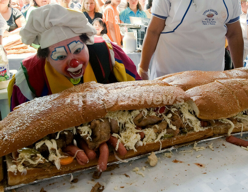トルタは、牛肉や、鶏肉、アボカド、七面鳥の肉、トマト、豆、ハム、さまざまな種類のチーズをはさんだサンドイッチで、具材にはメキシコの辛味ソース「モーレ」がかけられている。写真は、長さ46メートルの巨大メキシコ風サンドイッチ「トルタ」を作る道化師(2009年7月31日撮影)。(c)AFP/Luis Acosta