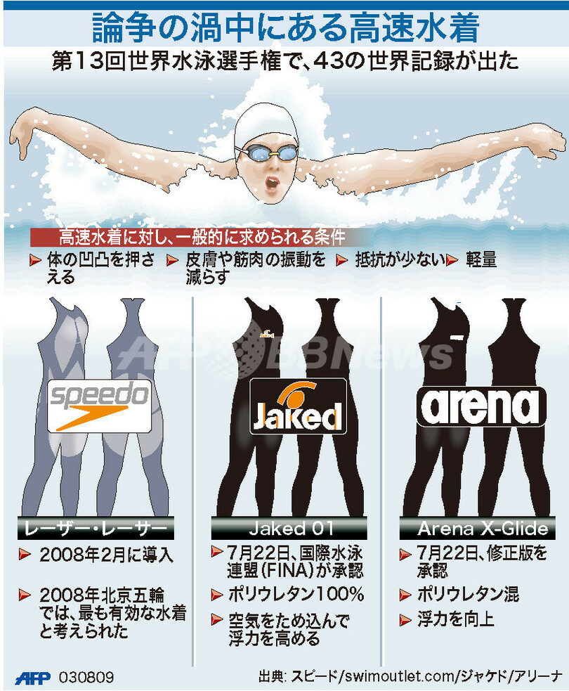 スポーツ スポーツ その他 図解 【図解】世界記録連発、高速水着が論争に 2009年8月3日 21:47 発信地:イタリア [ ヨーロッパ イタリア ] このニュースをシェア (c)AFP 【8月3日 AFP】図は、イタリアのローマ(Rome)で開催された第13回世界水泳選手権(13th World Swimming Championships)で、43の世界記録が出たために論争の渦中にある高速水着について示したもの。(c)AFP<ニュース解説画像一覧へ> スポーツ その他 一覧へ> メディア・報道関係・法人の方向け 写真・動画 購入のお問合せ>
