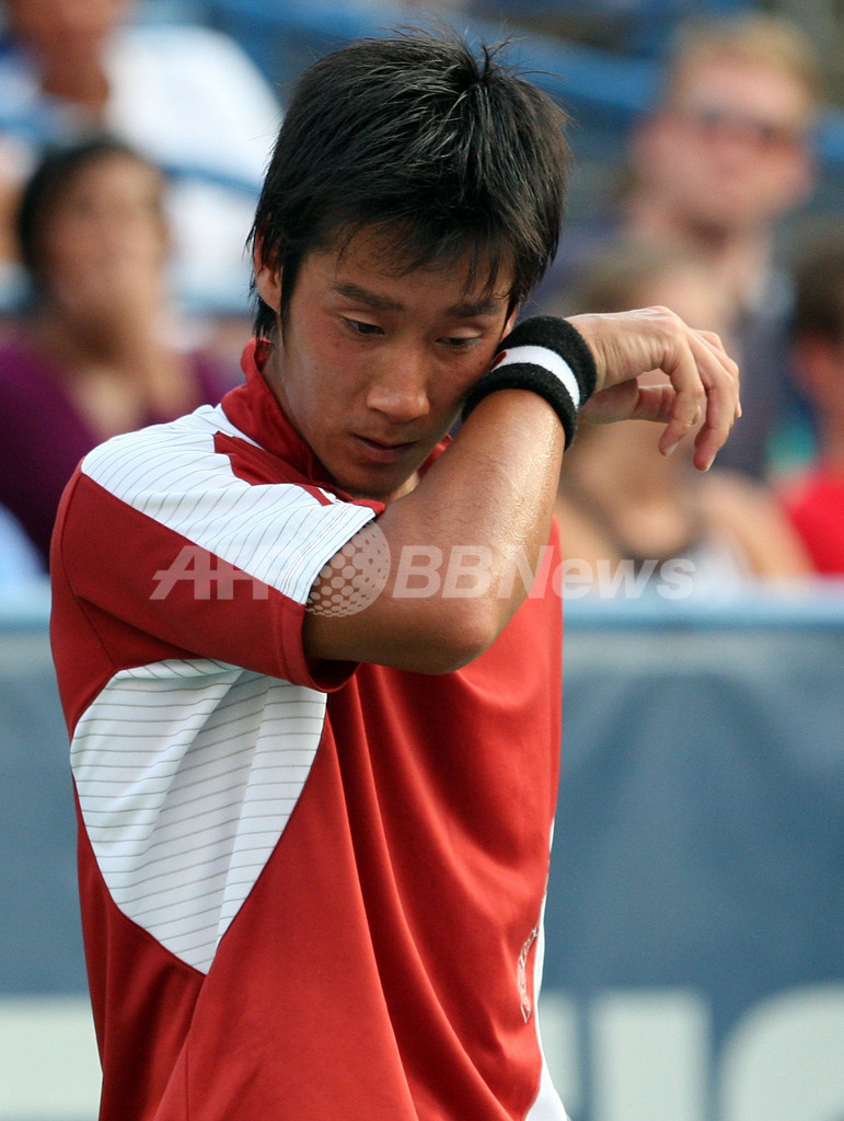 男子テニス、レッグ・メーソン・テニス・クラシック(%%Legg Mason Tennis Classic 2009%%)シングルス1回戦。杉田祐一(%%Yuichi Sugita%%、日本)は、ソムデヴ・デヴァーマン(%%Somdev Devvarman%%、インド)と対戦。杉田は6-0、7-6で敗れた。写真はポイントを奪われて落胆する杉田祐一。(2009年8月3日撮影)(c)AFP/Getty Images/Jim McIsaac