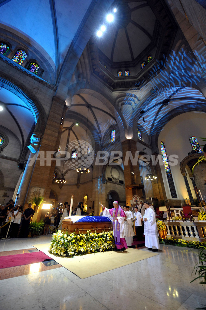 ニュース 政治・経済 マニラ市民、アキノ元比大統領に最後のお別れ 2009年8月4日 13:11 発信地:マニラ/フィリピン [ アジア・オセアニア フィリピン ] このニュースをシェア ‹ › ❮ 4/13 ❯ 1日に死去したフィリピンのコラソン・アキノ(Corazon Aquino)元大統領のひつぎが3日、マニラ(Manila)首都圏内を巡った後、マニラ大聖堂(Manila Cathedral)に安置された。通りを埋め尽くした市民らは、元大統領のシンボルカラーだった黄色の紙ふぶきや花をひつぎに投げかけ、「ピープルパワー」の象徴だった元大統領の死を悼んだ。写真は、マニラ大聖堂に安置されたアキノ氏のひつぎ(2009年8月3日撮影)。(c)AFP/JAY DIRECTO 画像作成中 ! 【8月4日 AFP】1日に死去したフィリピンのコラソン・アキノ(Corazon Aquino)元大統領のひつぎが3日、マニラ(Manila)首都圏内を巡った後、マニラ大聖堂(Manila Cathedral)に安置された。通りを埋め尽くした市民らは、元大統領のシンボルカラーだった黄色の紙ふぶきや花をひつぎに投げかけ、「ピープルパワー」の象徴だった元大統領の死を悼んだ。(c)AFP 政治・経済 一覧へ> メディア・報道関係・法人の方向け 写真・動画 購入のお問合せ>