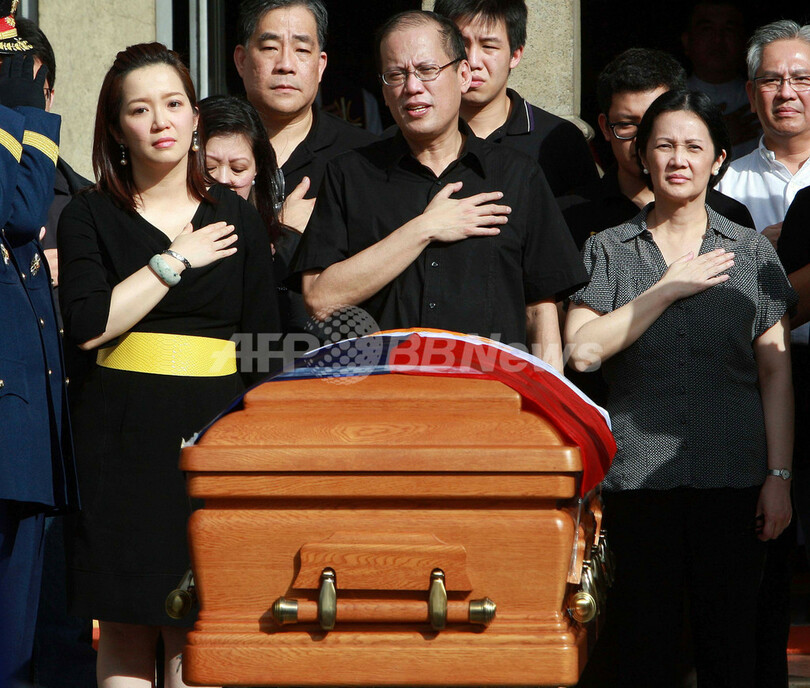 1日に死去したフィリピンのコラソン・アキノ(Corazon Aquino)元大統領のひつぎが3日、マニラ(Manila)首都圏内を巡った後、マニラ大聖堂(Manila Cathedral)に安置された。通りを埋め尽くした市民らは、元大統領のシンボルカラーだった黄色の紙ふぶきや花をひつぎに投げかけ、「ピープルパワー」の象徴だった元大統領の死を悼んだ。写真は、マニラ大聖堂に安置されたひつぎを前に、国家を歌う元大統領の娘や息子たち(2009年8月3日撮影)。(c)AFP/FRANCIS R. MALASIG