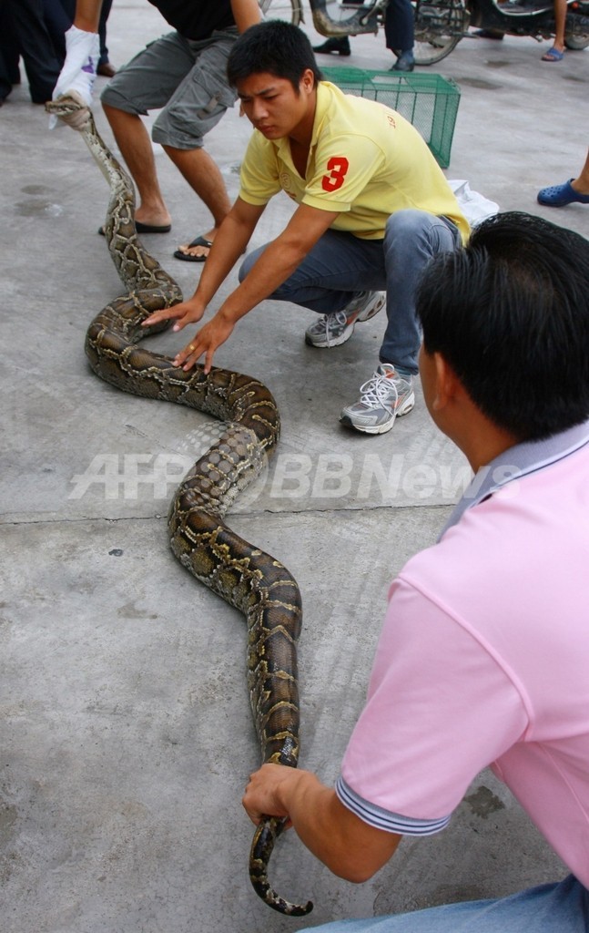 ニュース ライフ こぼれ話 野菜市場に大ヘビ出現、中国 2009年8月4日 22:02 発信地:三亜/中国 [ 中国・台湾 中国 ] このニュースをシェア ‹ › ❮ 3/5 ❯ 中国・海南島(Hainan)三亜(Sanya)市で、野菜市場で大ヘビが捕獲された。ヘビはその後、同市の動物園に預けられた(2009年7月31日撮影)。(c)AFP/CHINA XTRA 画像作成中 ! 【8月4日 AFP】31日、中国・海南島(Hainan)三亜(Sanya)市の野菜市場で大ヘビが捕獲された。ヘビはその後、同市の動物園に預けられた。(c)AFP ライフ 一覧へ> メディア・報道関係・法人の方向け 写真・動画 購入のお問合せ>