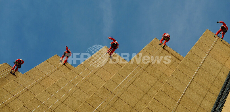 写真は、ホテルの壁を屋根から降りるサンタたち(2009年8月5日撮影)。(c)AFP/Greg WOOD