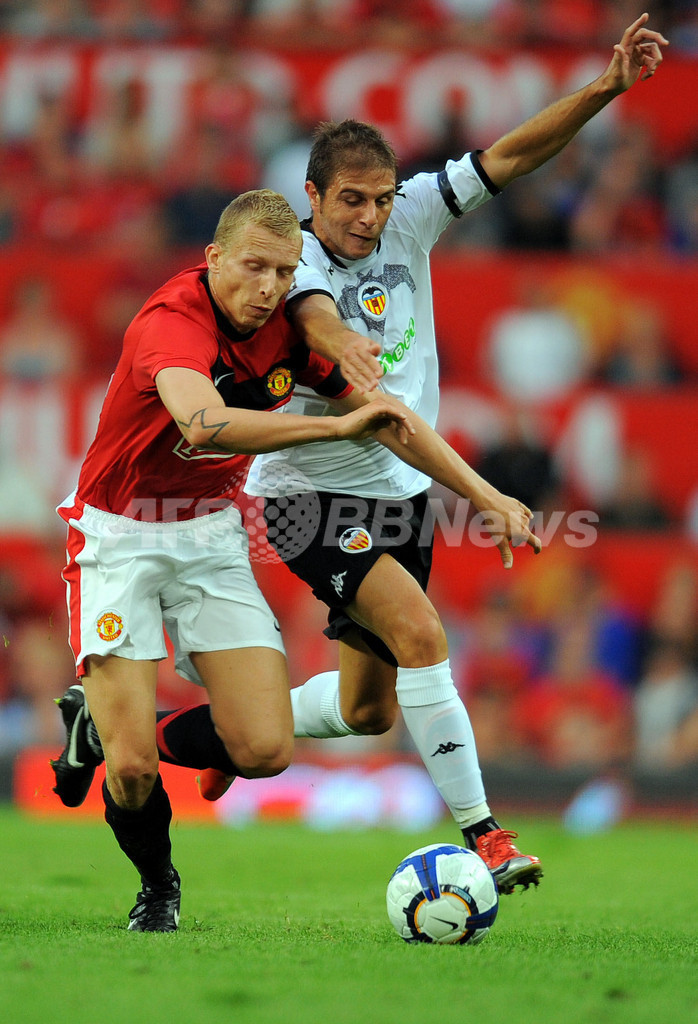 サッカー親善試合、マンチェスター・ユナイテッド(%%Manchester United%%)対バレンシア(%%Valencia CF%%)。試合はマンチェスター・ユナイテッドが2-0で勝利した。写真はパブロ・エルナンデス(%%Pablo Hernandez%%)と競り合うマンチェスター・ユナイテッドのリッチー・デ・ラート(%%Richie De Laet%%、左)。(2009年8月5日撮影)(c)AFP/ANDREW YATES