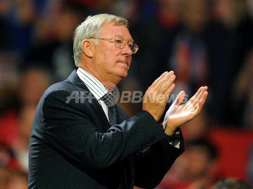 サッカー親善試合、マンチェスター・ユナイテッド(%%Manchester United%%)対バレンシア(%%Valencia CF%%)。試合はマンチェスター・ユナイテッドが2-0で勝利した。写真はサポーターの声援に応えるマンチェスター・ユナイテッドのアレックス・ファーガソン(%%Alex Ferguson%%)監督。(2009年8月5日撮影)(c)AFP/ANDREW YATES