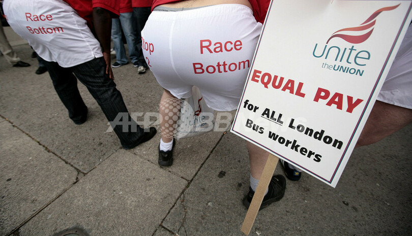 ニュース 政治・経済 こぼれ話 ロンドンのバス運転手ら、「お尻」で賃金格差に抗議 2009年8月6日 17:30 発信地:ロンドン/英国 [ ヨーロッパ 英国 ] このニュースをシェア ‹ › ❮ 4/4 ❯ 英ロンドン(London)中心街で、バス会社間での賃金格差に抗議して尻をカメラに向けて突き出すバス運転手の男性(2009年8月5日撮影)。(c)AFP/SHAUN CURRY 画像作成中 ! 【8月6日 AFP】ロンドン(London)の中心街で5日、市内を走るバスの運転手やバス会社の労働組合員らが、会社間での賃金格差に抗議する集会を開き、「低賃金争い(racing to the bottom)をやめろ」との主張にかけて、尻(bottom)をカメラに向けて突き出すパフォーマンスを行った。(c)AFP 政治・経済 一覧へ> メディア・報道関係・法人の方向け 写真・動画 購入のお問合せ>