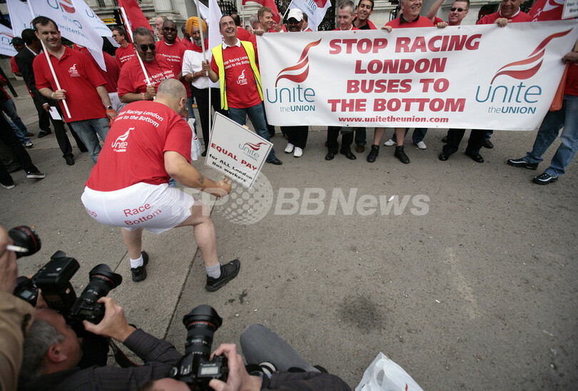 ニュース 政治・経済 こぼれ話 ロンドンのバス運転手ら、「お尻」で賃金格差に抗議 2009年8月6日 17:30 発信地:ロンドン/英国 [ ヨーロッパ 英国 ] このニュースをシェア ‹ › ❮ 2/4 ❯ 英ロンドン(London)中心街で、バス会社間での賃金格差に抗議して尻をカメラに向けて突き出すバス運転手の男性(2009年8月5日撮影)。(c)AFP/SHAUN CURRY 画像作成中 ! 【8月6日 AFP】ロンドン(London)の中心街で5日、市内を走るバスの運転手やバス会社の労働組合員らが、会社間での賃金格差に抗議する集会を開き、「低賃金争い(racing to the bottom)をやめろ」との主張にかけて、尻(bottom)をカメラに向けて突き出すパフォーマンスを行った。(c)AFP 政治・経済 一覧へ> メディア・報道関係・法人の方向け 写真・動画 購入のお問合せ>