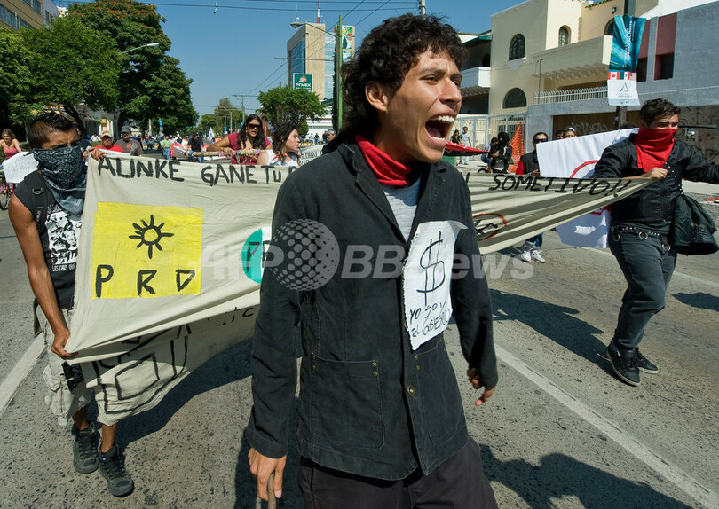 メキシコ・グアダラハラ(Guadalajara)で9日、北米3か国首脳会談「北米の安全と繁栄のためのパートナーシップ(Security and Prosperity Partnership of North America、SPP)」が2日間の日程で始まった。フェリペ・カルデロン(Felipe Calderon)大統領、米国のバラク・オバマ(Barack Obama)大統領、カナダのスティーブン・ハーパー(Stephen Harper)首相が出席。グアダラハラではSPP開催にあわせ、環境団体などが抗議行動を行った。写真は抗議行動に参加する人びと(2009年8月9日撮影)。(c)AFP/Ronaldo Schemidt