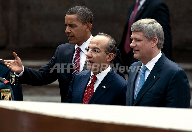 メキシコ中部グアダラハラ(Guadalajara)で開催されていた、米、カナダ、メキシコによる北米3か国首脳会談「北米の安全と繁栄のためのパートナーシップ(Security and Prosperity Partnership of North America、SPP)」は10日、麻薬犯罪対策や新型インフルエンザ対策での協力関係強化で一致し、閉幕した。会談にはバラク・オバマ(Barack Obama)米大統領、フェリペ・カルデロン(Felipe Calderon)メキシコ大統領、スティーブン・ハーパー(Stephen Harper)カナダ首相が出席した。写真は、会場となったカバーニャス文化センター(Cabanas Cultural Center)で、記念撮影に臨む(左から)オバマ大統領、カルデロン大統領、ハーパー首相(2009年8月10日撮影)。(c)AFP/Ronaldo Schemidt