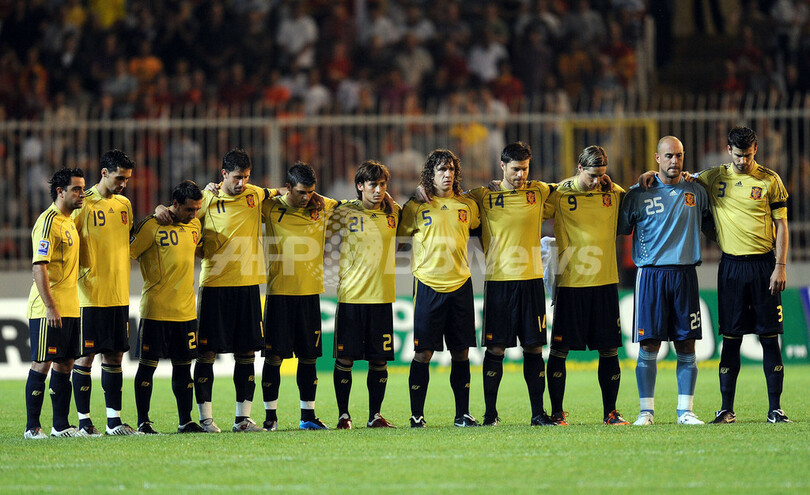 スペインの選手たちは試合前、8日にチームの遠征先イタリアで亡くなった同国1部リーグのRCDエスパニョール(%%RCD Espanyol%%)のダニエル・ジャルケ(%%Daniel Jarque%%)の背番号と名前が入ったユニフォームを着て、同選手に哀悼の意を表した。写真は試合前にジャルケに黙祷(もくとう)を捧げるスペインの選手たち。(2009年8月12日撮影)(c)AFP/ROBERT ATANASOVSKI