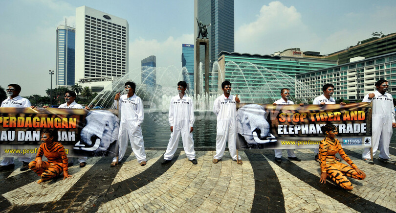 野生生物保護団体、トラにふんしてデモ インドネシア