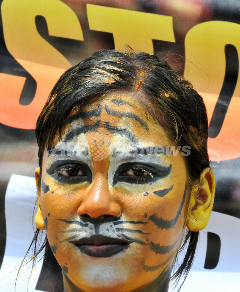 野生生物保護団体、トラにふんしてデモ インドネシア