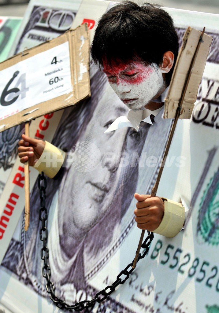ニュース 政治・経済 国の借金減らして、「お札」から頭出し訴える インドネシア 2009年8月14日 15:02 発信地:ジャカルタ/インドネシア [ アジア・オセアニア インドネシア ] このニュースをシェア ‹ › ❮ 2/2 ❯ インドネシア・ジャカルタ(Jakarta)で、大きなつくりもののお札を掲げ、国の借金を減らすよう訴える人(2009年8月13日撮影)。(c)AFP/Bay ISMOYO 画像作成中 ! 【8月14日 AFP】インドネシア・ジャカルタ(Jakarta)で13日、活動家が大きなつくりもののお札を掲げ、国の借金を減らすよう訴えた。国際通貨基金(International Monetary Fund、IMF)は、2009年のインドネシア経済の成長率を3.5パーセントと予測している。(c)AFP 政治・経済 一覧へ> メディア・報道関係・法人の方向け 写真・動画 購入のお問合せ>