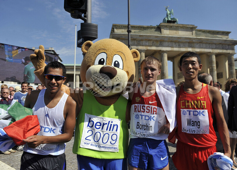 禁止薬物を使用し、2005年から06年にかけて1年間の出場停止処分を受けていたボルチンは序盤、抑え気味のレースを展開したが、中国の王浩(%%Hao Wang%%、ワン・ハオ、中国)、メキシコのエデル・サンチェス(%%Eder Sanchez%%)を抑えて優勝を果たした。写真は競技後、カメラの前でポーズをとる(左から)3位のエデル・サンチェス、大会公式マスコットのベルリーノ(Berlino)、優勝したワレリー・ボルチン、2位に入った王浩。(2009年8月15日撮影)(c)AFP/DDP/OLIVER LANG