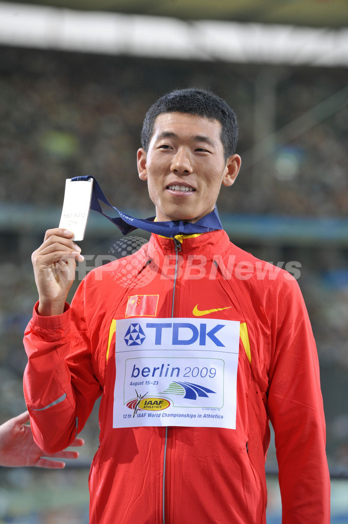 禁止薬物を使用し、2005年から06年にかけて1年間の出場停止処分を受けていたボルチンは序盤、抑え気味のレースを展開したが、中国の王浩(%%Hao Wang%%、ワン・ハオ、中国)、メキシコのエデル・サンチェス(%%Eder Sanchez%%)を抑えて優勝を果たした。写真は表彰台で銀メダルを手にする王浩。(2009年8月15日撮影)(c)AFP/JOHN MACDOUGALL