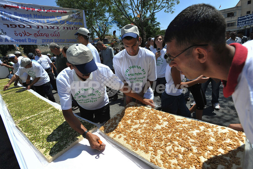 ニュース ライフ こぼれ話 巨大な伝統菓子作りでギネスに挑戦、イスラエル 2009年8月16日 15:20 発信地:ナザレ/イスラエル [ 中東・北アフリカ イスラエル ] このニュースをシェア ‹ › ❮ 1/2 ❯ イスラエル北部ナザレ(Nazareth)で、世界最大の「ハラワ(halawa)」作りに挑戦する人たち(2009年8月15日撮影)。(c)AFP PHOTO/YEHUDA RAIZNER 画像作成中 ! 【8月16日 AFP】イスラエル北部ナザレ(Nazareth)で15日、ギネス世界記録を目指し、世界最大の「ハラワ(halawa)」を作る地元当局主催のイベントが行われた。「ハラワ」は同国の伝統的なお菓子。イベントでは長さ200メートル、重さ3700キロの巨大な「ハラワ」が完成した。(c)AFP ライフ 一覧へ> メディア・報道関係・法人の方向け 写真・動画 購入のお問合せ>
