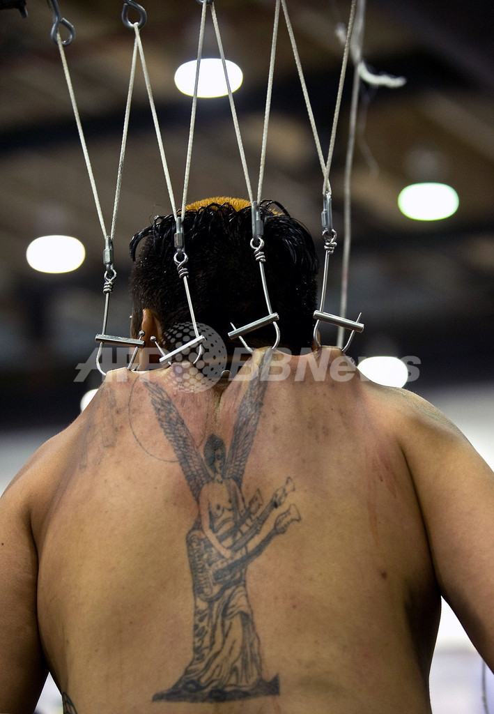 ニュース ライフ こぼれ話 「背中の皮膚にフックで宙づり」でギネスに挑戦 2009年8月16日 15:58 発信地:メキシコ市/メキシコ [ 中南米 メキシコ ] このニュースをシェア ‹ › ❮ 8/8 ❯ 背中に直接フックを引っかけて3時間宙づり状態でいるというギネス世界記録に挑戦する、タトゥーアーティストのホルヘ・カストロ(Jorge Castro)さん。この挑戦は、メキシコの首都メキシコ市(Mexico City)にある世界貿易センター(World Trade Center)で開催された国際タトゥー大会の期間中に行われた。(2009年8月15日撮影)。(c)AFP/Ronaldo Schemidt 画像作成中 ! 【8月16日 AFP】背中の皮膚に直接フックを引っかけ3時間宙づり状態でいるというギネス世界記録に挑戦する、タトゥーアーティストのホルヘ・カストロ(Jorge Castro)さん。この挑戦は、メキシコの首都メキシコ市(Mexico City)にある世界貿易センター(World Trade Center)で開催された国際タトゥー大会の期間中に行われた。(c)AFP ライフ 一覧へ> メディア・報道関係・法人の方向け 写真・動画 購入のお問合せ>