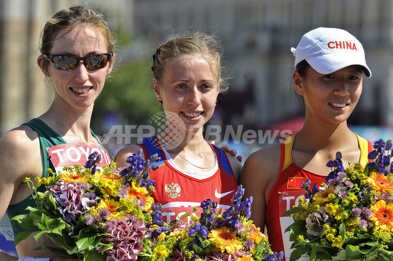オリーブ・ローネイン(%%Olive Loughnane%%、アイルランド)が1時間28分58秒で2位、劉虹(%%Hong Liu%%、中国)が1時間29分10秒で3位に入った。写真は競技を終え、カメラの前でポーズをとる(左から)2位のオリーブ・ローネイン、優勝したオリガ・カニスキナ、3位の劉虹。(2009年8月16日撮影)(c)AFP/JOHN MACDOUGALL