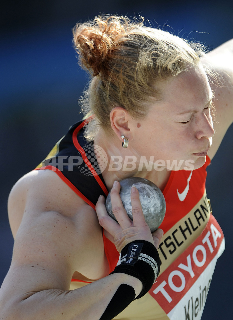 20メートル20でナディネ・クライナート(%%Nadine Kleinert%%、ドイツ)が2位、19メートル89で鞏立綺(%%Lijiao Gong%%、キョウ・リツコウ、中国)が3位に入った。写真は投てきするナディネ・クライナート。(2009年8月16日撮影)(c)AFP/FABRICE COFFRINI