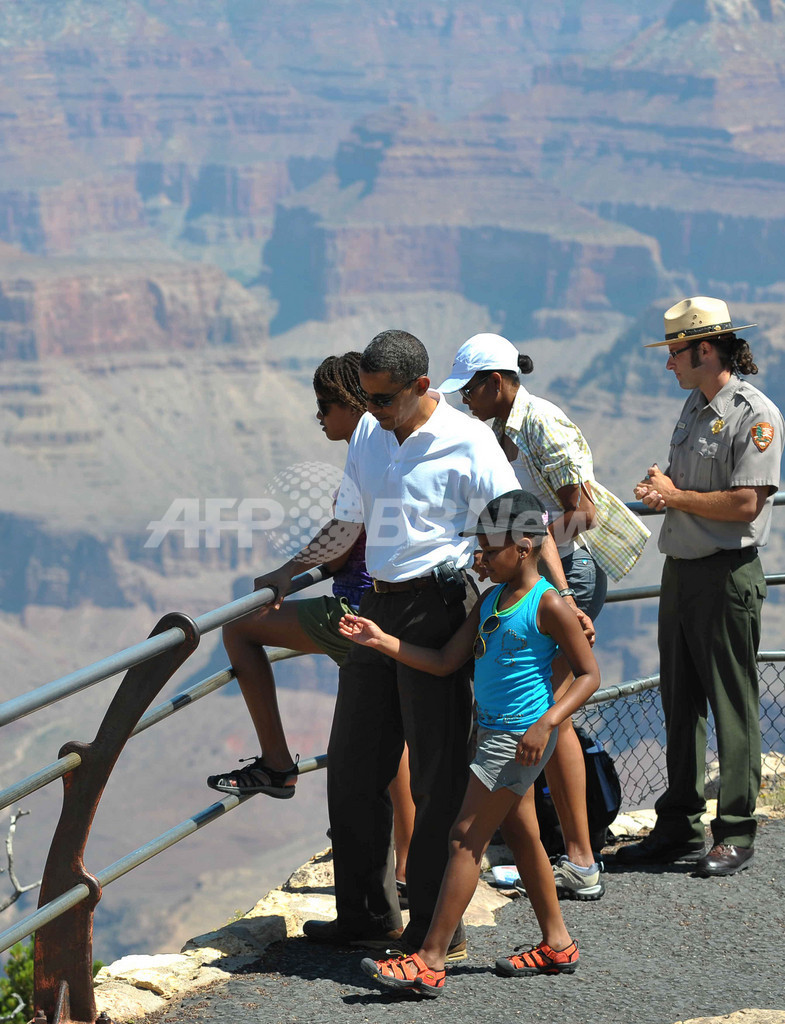 週末をワイオミング(Wyoming)州イエローストーン国立公園(Yellowstone National Park)など、国内の国立公園でハイキング、釣り、川下りなどを楽しんだオバマ一家。休暇の締めくくりにグランドキャニオンを訪れた。