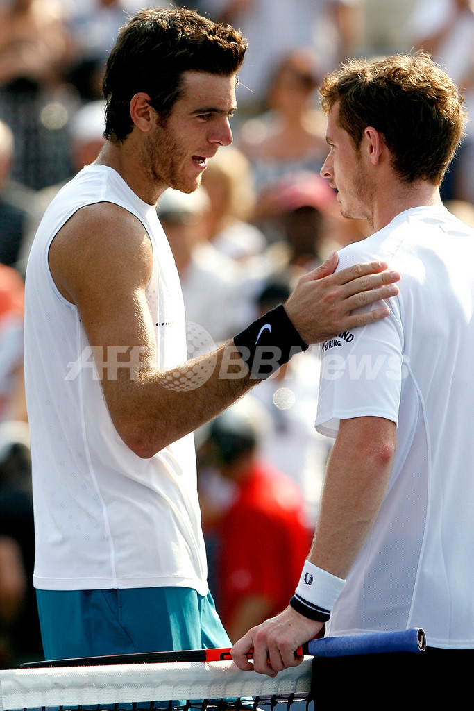 男子テニス、ロジャーズ・カップ(%%Rogers Cup 2009%%)シングルス決勝。大会第3シードのアンディ・マレー(%%Andy Murray%%、英国)は、大会第6シードのファン・マルティン・デルポトロ(%%Juan Martin Del Potro%%、アルゼンチン)と対戦。マレーは6-7、7-6、6-1で勝利し、シーズン5勝目を挙げた。写真は試合を終え、ファン・マルティン・デルポトロと言葉を交わすアンディ・マレー(右)。(2009年8月16日撮影)(c)AFP/Getty Images/Matthew Stockman