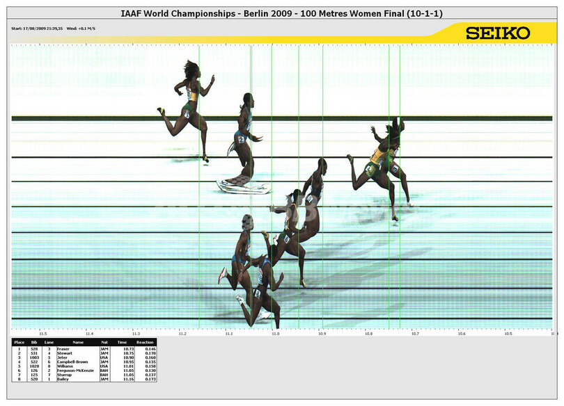 10秒75を記録したカーロン・スチュワート(%%Kerron Stewart%%、ジャマイカ)が2位、 10秒90を記録したカルメリタ・ジーター(%%Carmelita Jeter%%、米国)が3位に入った。写真は女子100メートル決勝の着順差を示したもの。右がシェリーアン・フレーザー。(2009年8月17日撮影)(c)AFP/SEIKO