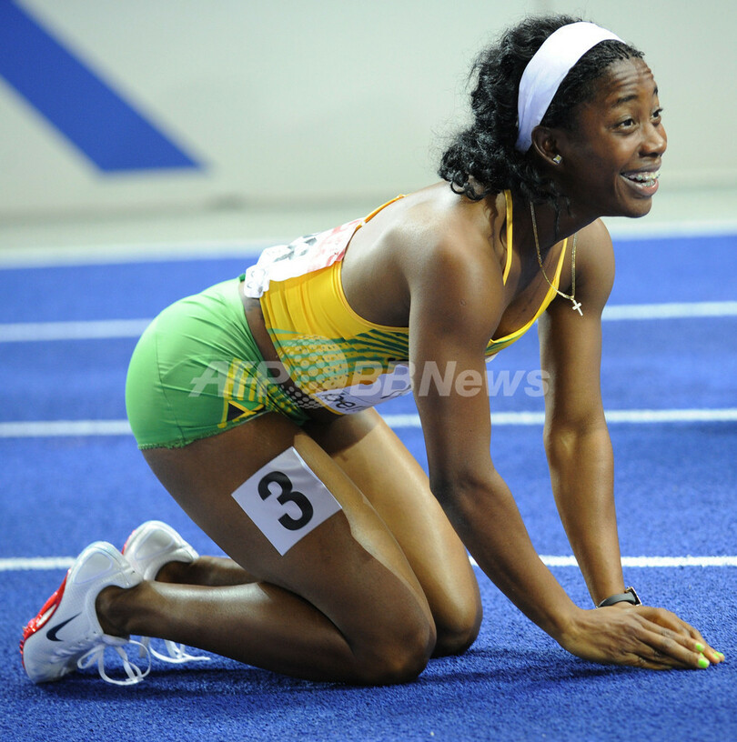 10秒75を記録したカーロン・スチュワート(Kerron Stewart、ジャマイカ)が2位、 10秒90を記録したカルメリタ・ジーター(Carmelita Jeter、米国)が3位に入った。(c)AFP