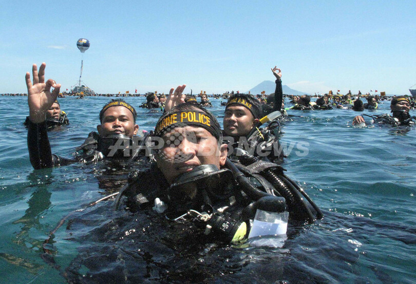 インドネシア海軍報道官によると、今回の挑戦はマナドを世界的な観光スポットにしようと、インドネシア政府が行った海関連のイベントの一部。64回目の独立記念日にあたり、ダイバーたちが海中にインドネシア国旗も立てた。「世界一の群島国家として、わが国が自分たちの海をきちんと管理でき、観光業の大きな可能性をもっていることを世界に示せた」と報道官は述べた。(c)AFP