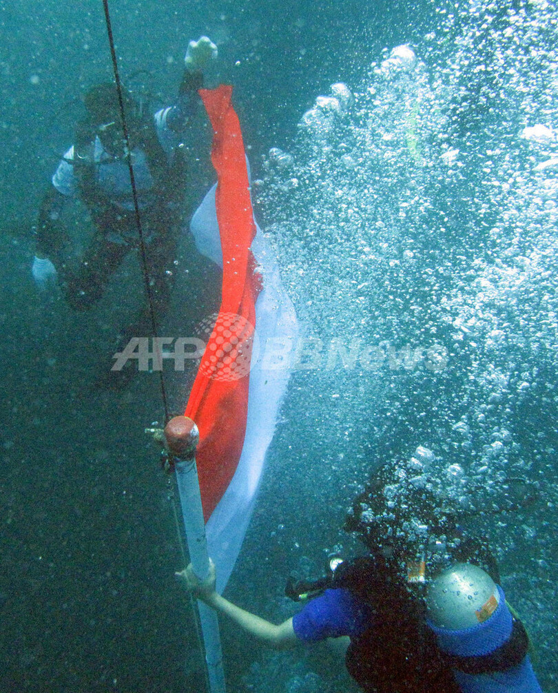インドネシア海軍報道官によると、今回の挑戦はマナドを世界的な観光スポットにしようと、インドネシア政府が行った海関連のイベントの一部。64回目の独立記念日にあたり、ダイバーたちが海中にインドネシア国旗も立てた。「世界一の群島国家として、わが国が自分たちの海をきちんと管理でき、観光業の大きな可能性をもっていることを世界に示せた」と報道官は述べた。(c)AFP
