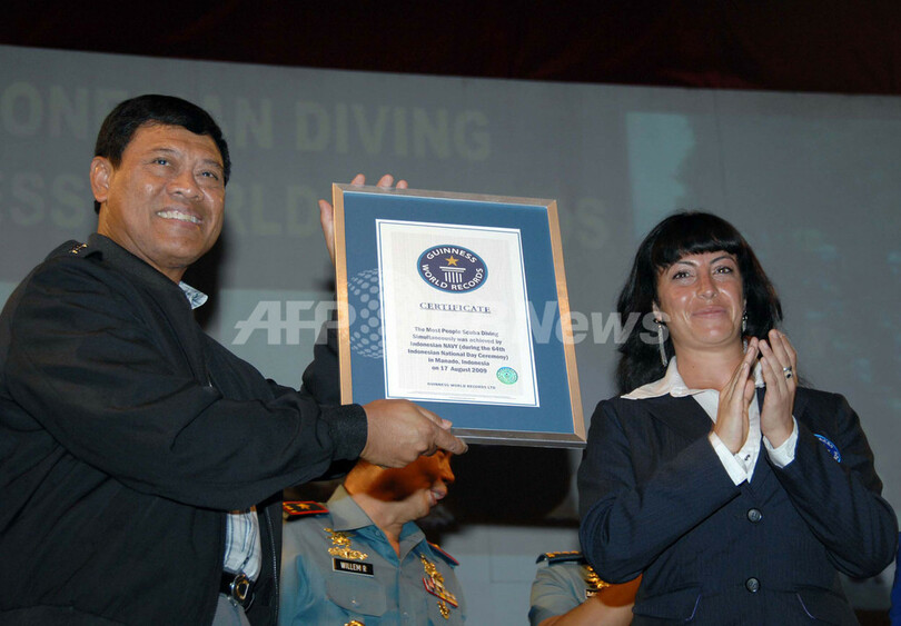 インドネシア海軍報道官によると、今回の挑戦はマナドを世界的な観光スポットにしようと、インドネシア政府が行った海関連のイベントの一部。64回目の独立記念日にあたり、ダイバーたちが海中にインドネシア国旗も立てた。「世界一の群島国家として、わが国が自分たちの海をきちんと管理でき、観光業の大きな可能性をもっていることを世界に示せた」と報道官は述べた。(c)AFP
