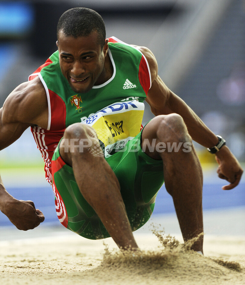 北京五輪の金メダリストで前回王者のネルソン・エボラ(%%Nelson Evora%%、ポルトガル)が17メートル55で2位、アレックス・コペロ(%%Alexis Copello%%、キューバ)が17メートル36で3位に入った。写真は17メートル55を記録し、2位に入ったネルソン・エボラ。(2009年8月18日撮影)(c)AFP/ADRIAN DENNIS