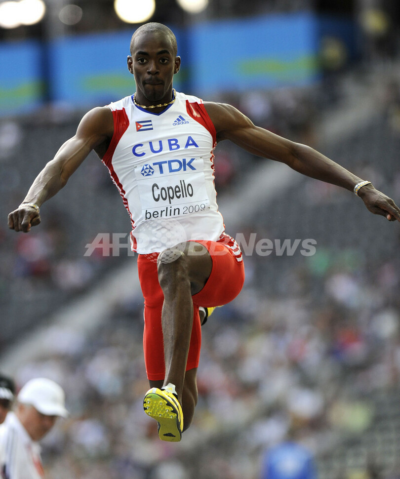 北京五輪の金メダリストで前回王者のネルソン・エボラ(%%Nelson Evora%%、ポルトガル)が17メートル55で2位、アレックス・コペロ(%%Alexis Copello%%、キューバ)が17メートル36で3位に入った。写真は17メートル36を記録し、3位に入ったアレックス・コペロ。(2009年8月18日撮影)(c)AFP/ADRIAN DENNIS