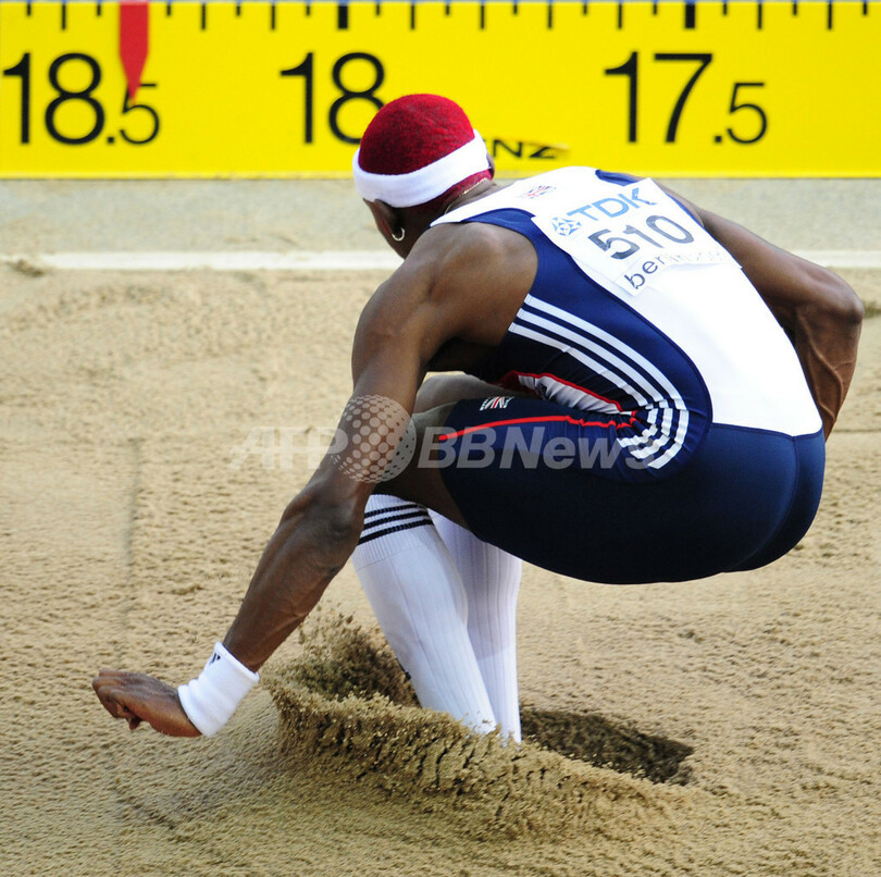 【8月19日 AFP】(20日写真追加)第12回世界陸上ベルリン大会(12th IAAF World Championships in Athletics Berlin)男子三段跳び決勝。北京五輪同種目銀メダリストのフィリップス・イドウ(Phillips Idowu、英国)が、シーズン最高記録となる17メートル73で優勝した。