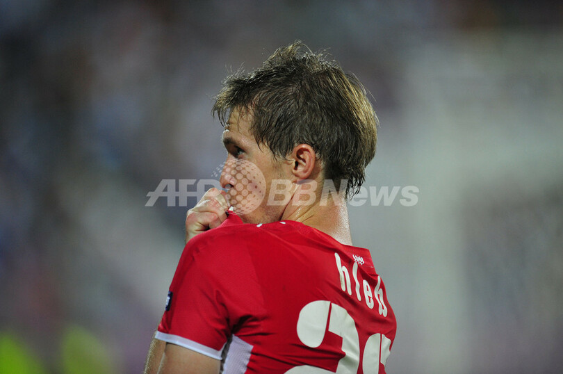 サッカー欧州チャンピオンズリーグ2009-10(%%UEFA Champions League 2009-10%%)プレーオフ、FCティミショアラ(%%FC Timisoara%%)対VfBシュツットガルト(%%VfB Stuttgart%%)第1戦。試合はアウェーのシュツットガルトが2-0で先勝した。写真は前半30分にチームの2点目を決めて喜びを表すシュツットガルトのアレクサンデル・フレブ(%%Alexander Hleb%%)。(2009年8月18日撮影)(c)AFP/DANIEL MIHAILESCU