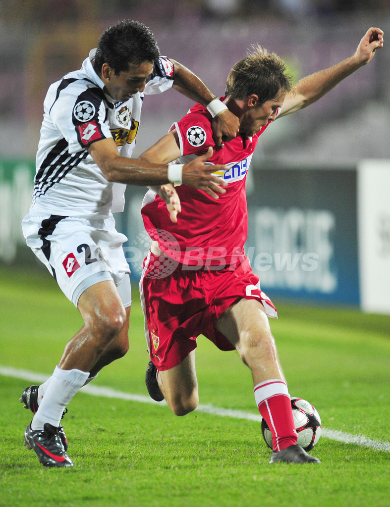 サッカー欧州チャンピオンズリーグ2009-10(%%UEFA Champions League 2009-10%%)プレーオフ、FCティミショアラ(%%FC Timisoara%%)対VfBシュツットガルト(%%VfB Stuttgart%%)第1戦。試合はアウェーのシュツットガルトが2-0で先勝した。写真はティミショアラのエデル(%%Eder Bonfim%%)と競り合うシュツットガルトのアレクサンデル・フレブ(%%Alexander Hleb%%、右)。(2009年8月18日撮影)(c)AFP/DANIEL MIHAILESCU