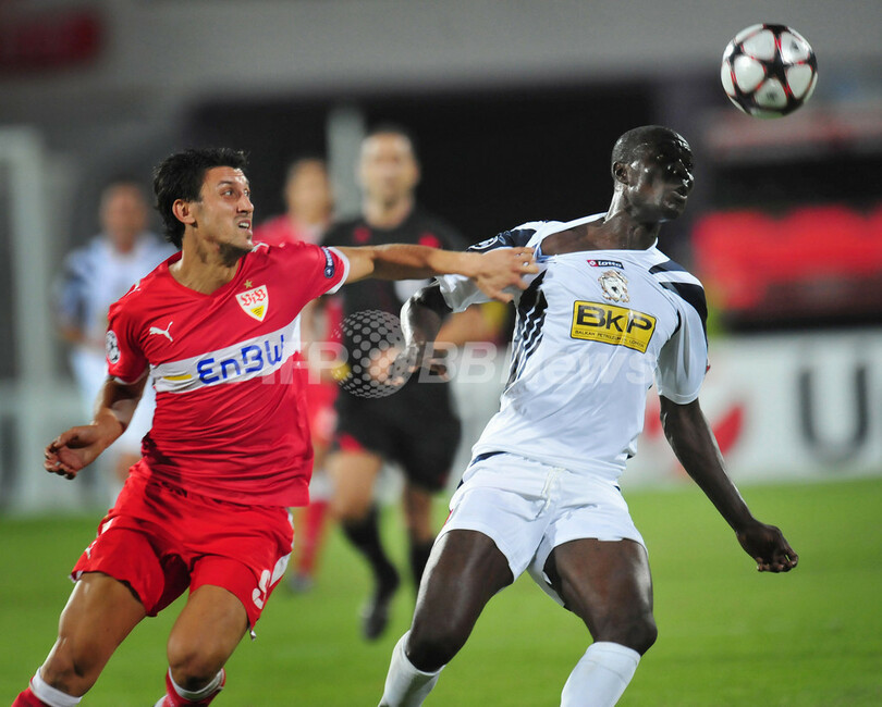 サッカー欧州チャンピオンズリーグ2009-10(%%UEFA Champions League 2009-10%%)プレーオフ、FCティミショアラ(%%FC Timisoara%%)対VfBシュツットガルト(%%VfB Stuttgart%%)第1戦。試合はアウェーのシュツットガルトが2-0で先勝した。写真はティミショアラのダレ・ニボンベ(%%Dare Nibombe%%)と競り合うシュツットガルトのチプリアン・マリカ(%%Ciprian Marica%%、左)。(2009年8月18日撮影)(c)AFP/DANIEL MIHAILESCU