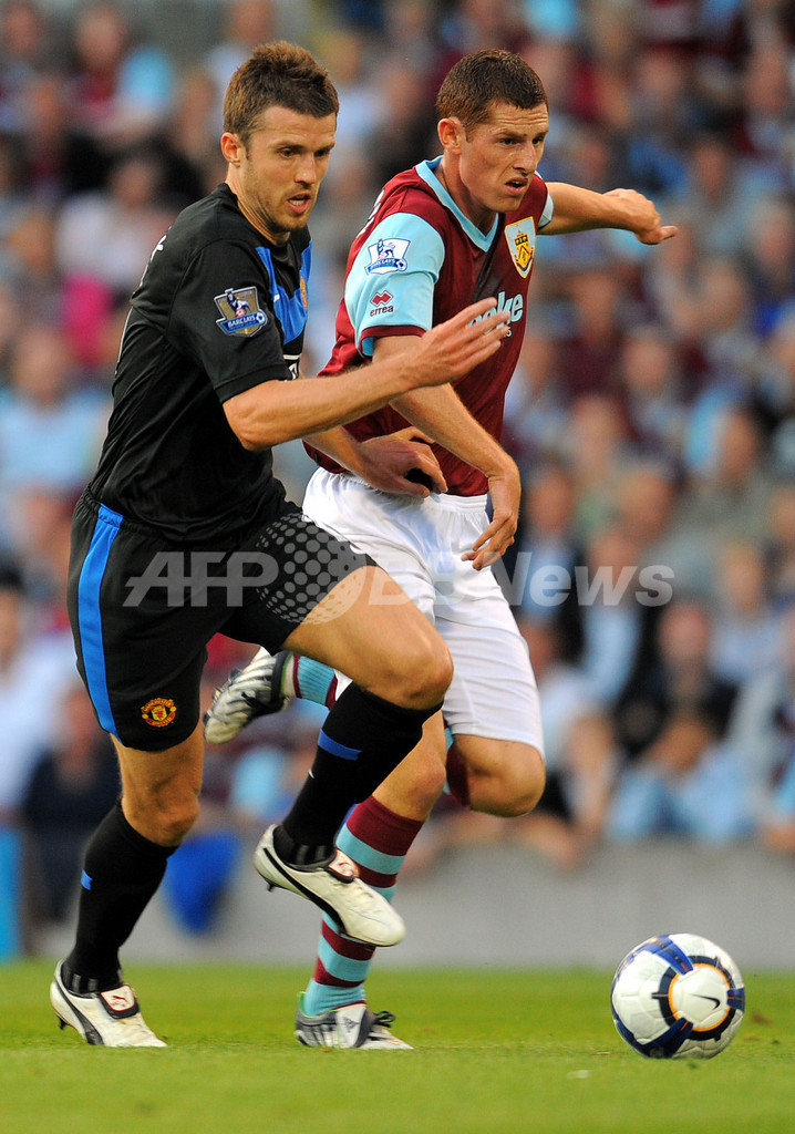 バーンリーは、後半にゴールキーパー(GK)ブリアン・イェンセン(%%Brian Jensen%%)がマイケル・キャリック(%%Michael Carrick%%)のペナルティーキック(PK)をセーブするなど、前半にロビー・ブレイク(%%Robbie Blake%%)が挙げた得点を守り切り、マンチェスター・ユナイテッドにシーズン初黒星をつけた。写真はクリス・マッキャン(%%Chris McCann%%)とボールを競るマンチェスター・ユナイテッドのマイケル・キャリック(左)。(2009年8月19日撮影)(c)AFP/ANDREW YATES