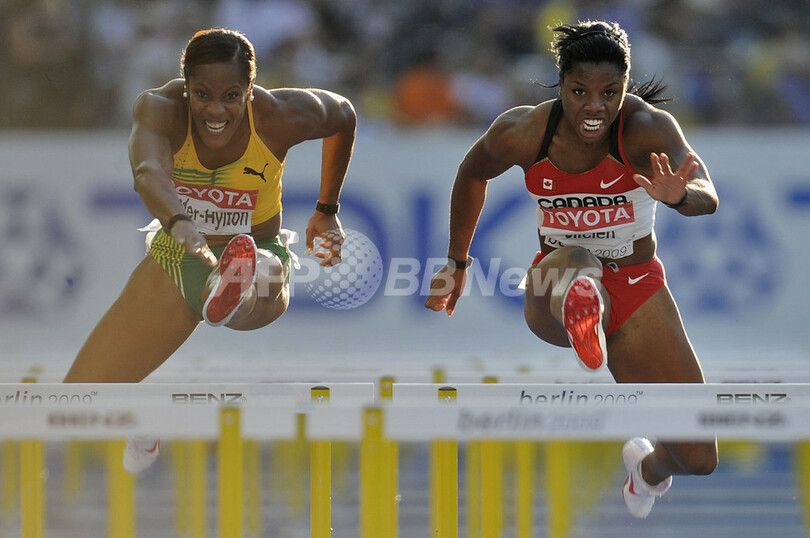 2位には12秒54で%%北京五輪%%同種目銅メダリストのプリシラ・ロペス・シュリエプ(%%Priscilla Lopes-Schliep%%、カナダ)が、3位には12秒55でデロリーン・エニス・ロンドン(%%Delloreen Ennis-London%%、ジャマイカ)が入った。写真は女子100メートルハードル決勝に出場するブリジット・フォスター・ヒルトン(左)。(2009年8月19日撮影)(c)AFP/OLIVIER MORIN