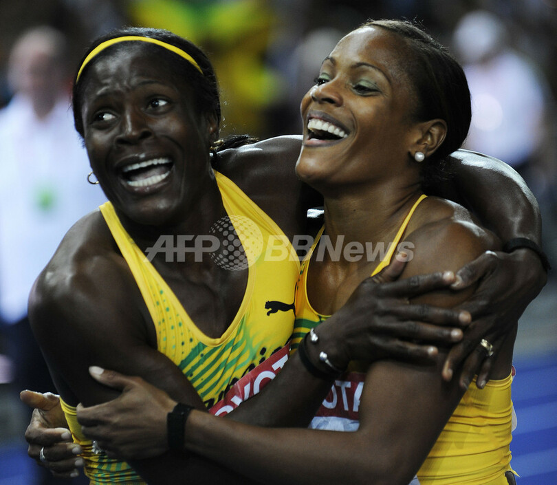 2位には12秒54で%%北京五輪%%同種目銅メダリストのプリシラ・ロペス・シュリエプ(%%Priscilla Lopes-Schliep%%、カナダ)が、3位には12秒55でデロリーン・エニス・ロンドン(%%Delloreen Ennis-London%%、ジャマイカ)が入った。写真は3位のデロリーン・エニス・ロンドンと喜びを分かち合うブリジット・フォスター・ヒルトン(右)。(2009年8月19日撮影)(c)AFP/ADRIAN DENNIS