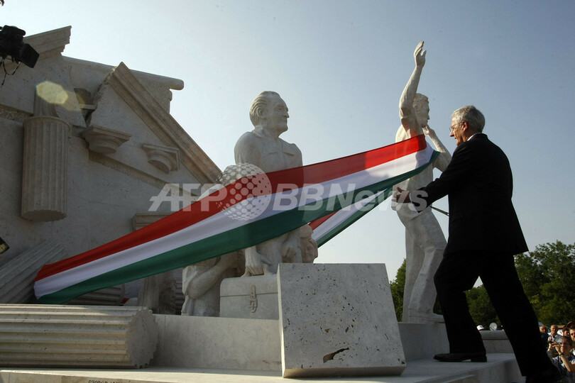 式典には、ハンガリーのショーヨム・ラースロー(Solyom Laszlo)大統領、オーストリアのミヒャエル・シュピンデルエッガー(Michael Spindelegger)欧州・国際関係相も出席。ベルリンの壁のかけらをはめ込んだ大理石の像の除幕式が行われた。(c)AFP/Eszter Balazs