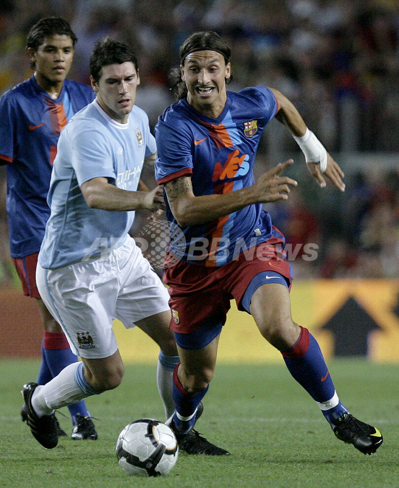 サッカー親善試合、ジョアン・ガンペール・トロフィー(%%Joan Gamper Trophy 2009%%)、FCバルセロナ(%%FC Barcelona%%)対マンチェスター・シティ(%%Manchester City%%)。試合はバルセロナが0-1で敗れた。写真はギャレス・バリー(%%Gareth Barry%%)をかわすバルセロナのズラタン・イブラヒモビッチ(%%Zlatan Ibrahimovic%%、右)。(2009年8月19日撮影)(c)AFP/JOSEP LAGO