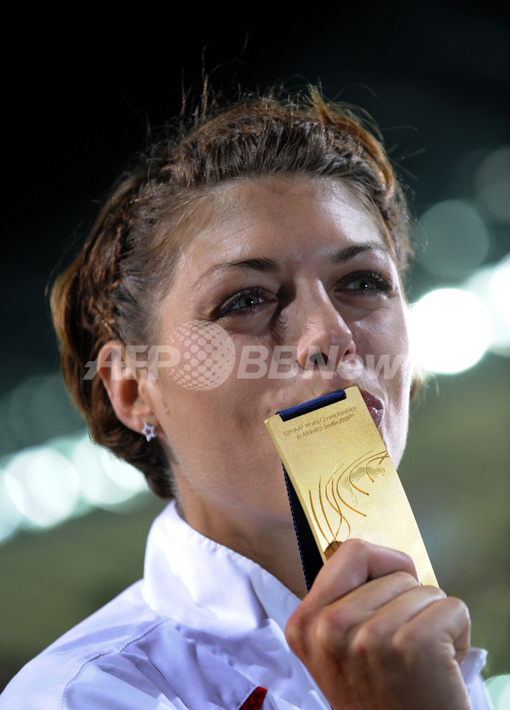 2位にはシーズン自己最高の2メートル02を記録したアンナ・チチェロワ(%%Anna Chicherova%%、ロシア)が入り、チチェロワと同じ2メートル02を記録した地元のアリアーネ・フリードリヒ(%%Ariane Friedrich%%、ドイツ)は、跳躍回数が多かったため3位だった。写真は表彰式でメダルにキスをするブランカ・ブラシッチ。(2009年8月20日撮影)(c)AFP/JOHN MACDOUGALL
