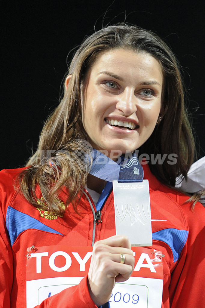 2位にはシーズン自己最高の2メートル02を記録したアンナ・チチェロワ(%%Anna Chicherova%%、ロシア)が入り、チチェロワと同じ2メートル02を記録した地元のアリアーネ・フリードリヒ(%%Ariane Friedrich%%、ドイツ)は、跳躍回数が多かったため3位だった。写真は表彰式でメダルを手にポーズをとるアンナ・チチェロワ。(2009年8月20日撮影)(c)AFP/JOHN MACDOUGALL
